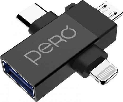 Pero Аксессуар AD14 OTG USB 3.0 - Lightning + USB-C + MicroUSB Black PRAD14BL